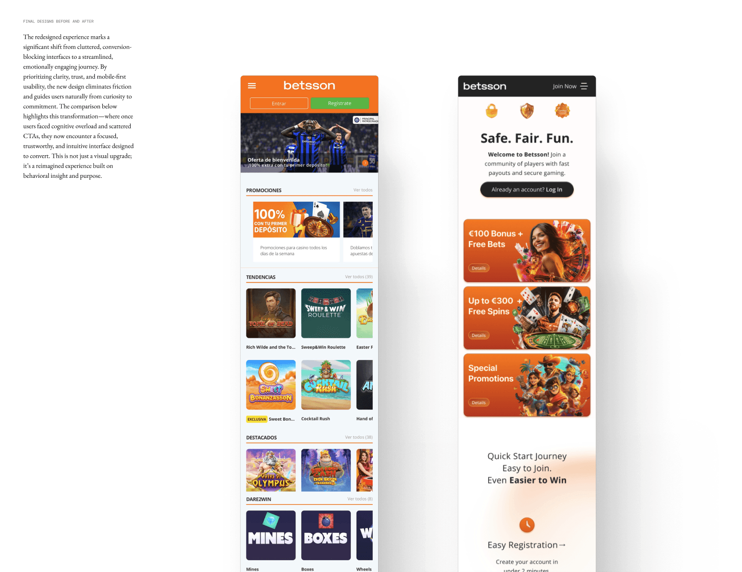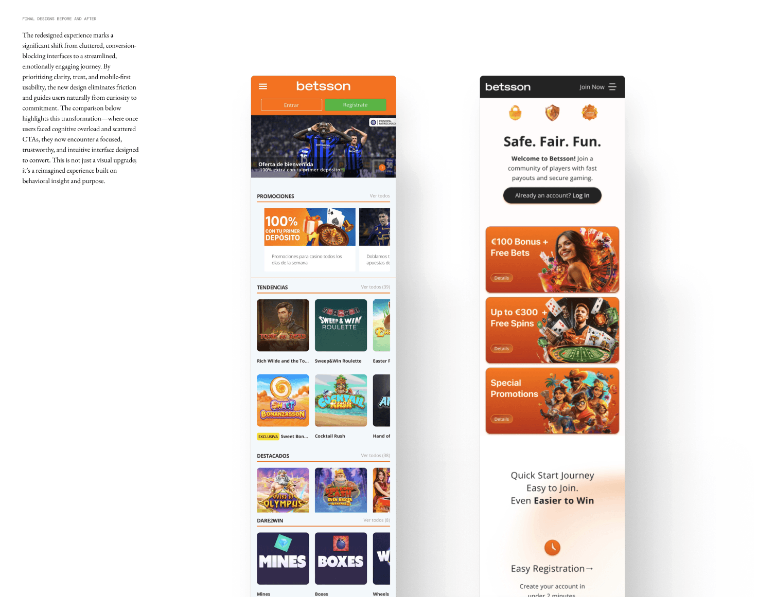 This project is a strategic redesign of the Betsson homesite, going beyond visual refresh to address deep UX and emotional barriers. The goal is clear: transform bounce into engagement and hesitation into confidence, driving conversions while strengthening the brand’s promise of security and excitement.