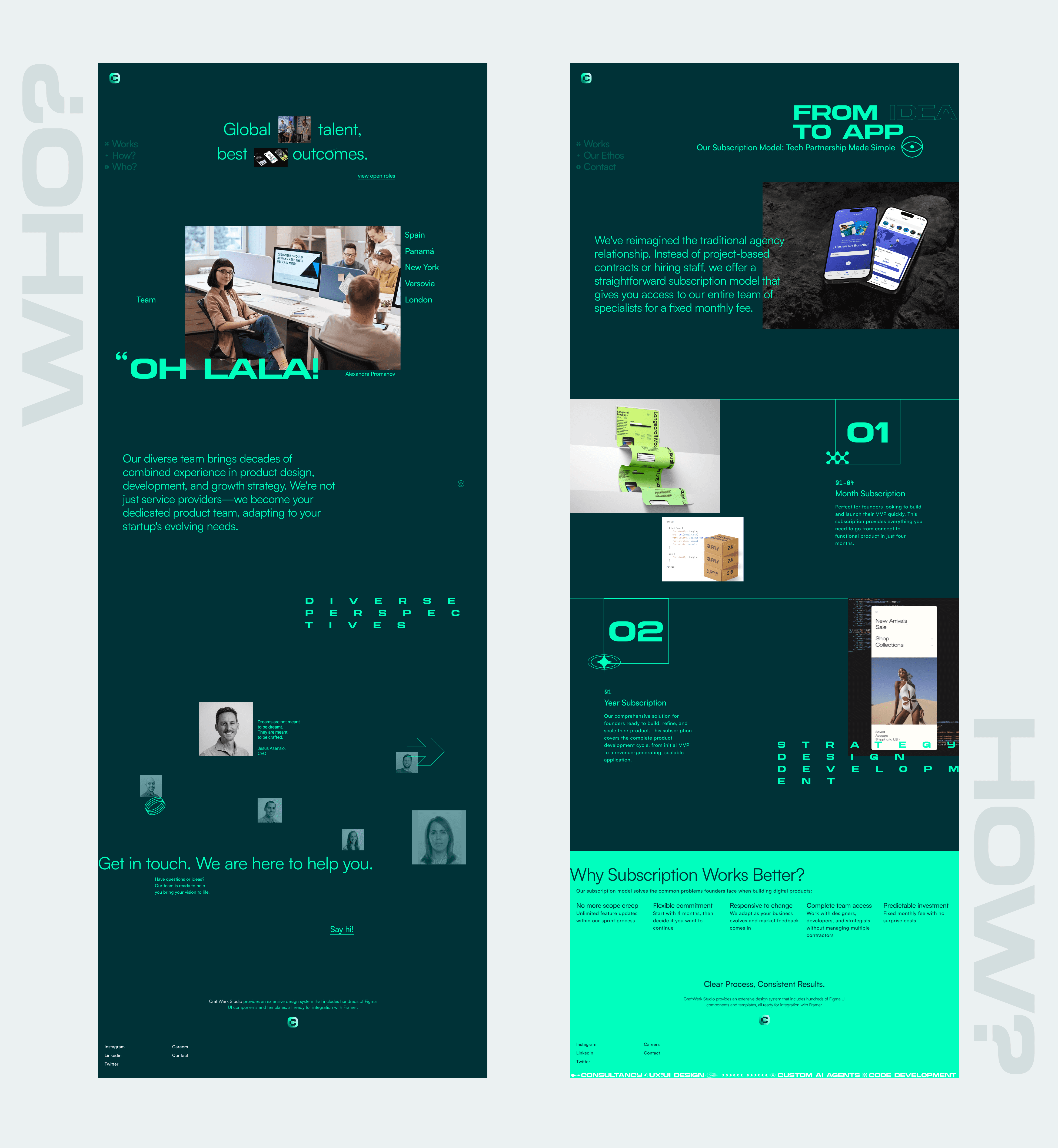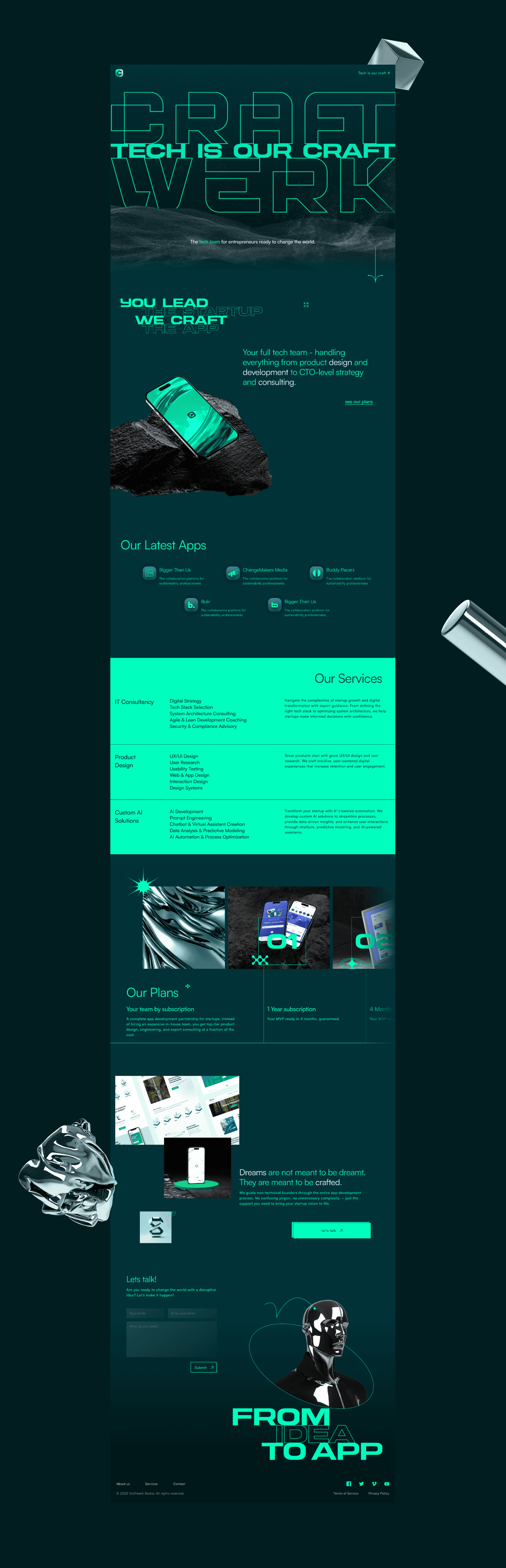 I was asked to redesign the branding and website for Craftwerk Studio, a dev agency that helps startups build their tech. I went for a bold, futuristic aesthetic with a neon green and dark theme to give it that high-tech, cutting-edge feel. The typography is strong and geometric, with a mix of outlined and filled text to create contrast and hierarchy. I incorporated abstract 3D elements and a moody, misty landscape to add depth and mystery. The goal was to make it feel dynamic and innovative while keeping the messaging clear: "You lead, we craft." The biggest challenge was balancing style with readability—some text effects look cool but could be tricky to read on smaller screens. Overall, the design makes a strong statement, but I might tweak the CTA visibility and navigation for an even smoother experience.